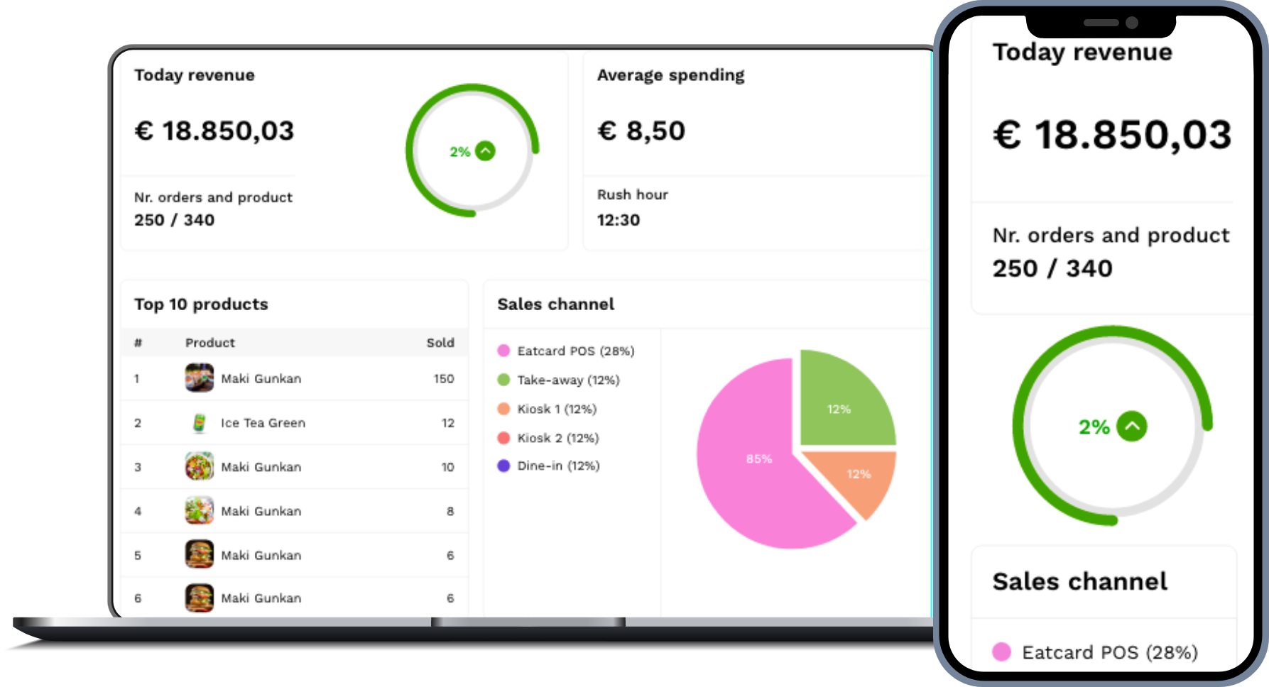 Met het kassa- en bezorgsysteem van Eatcard kunt u beginnen met het aanbieden van afhaal- en bezorgmaaltijden rechtstreek vanuit uw eigen custom made website. Tevens beschikt u ook over een online bestelling beheer waardoor u alle bestellingen via derden en uw eigen website binnen in één omgeving heeft. Met de Eatcard Riders App verleent u de beste service, werkt u efficiënter en bespaart u tijd. Zo heeft u binnen de app een Real Time GPS Tracking waardoor u inzicht krijgt in de voortgang van de bezorging en worden er altijd de snelste routes voorgesteld.
